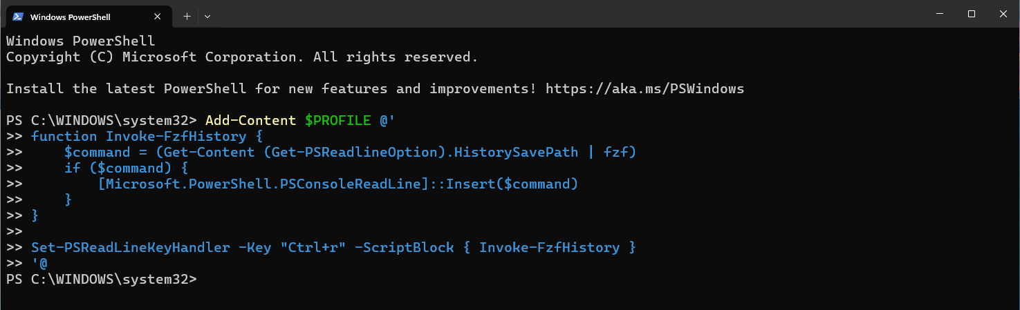 Set-PSReadLineKeyHandler -Key "Ctrl+r" -ScriptBlock { Invoke-FzfHistory }