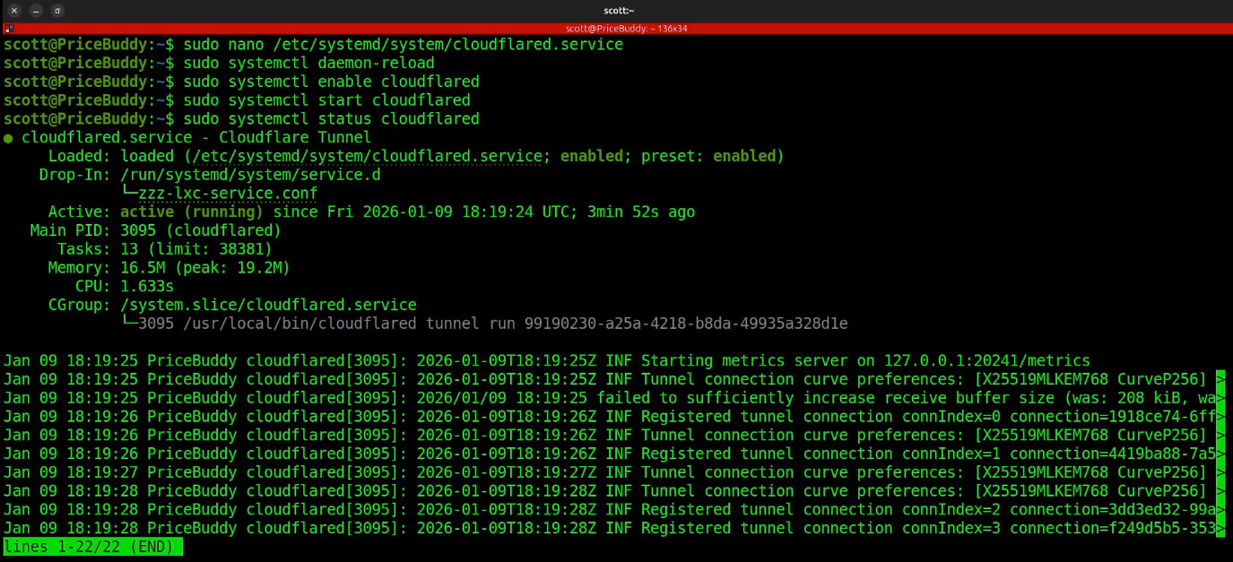Your PriceBuddy service is now available and running over a Cloudflare tunnel.