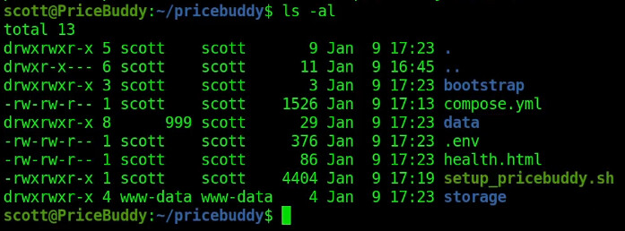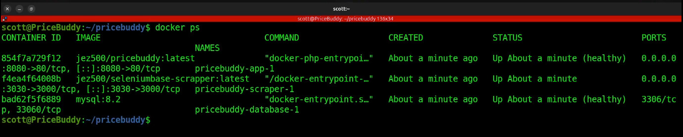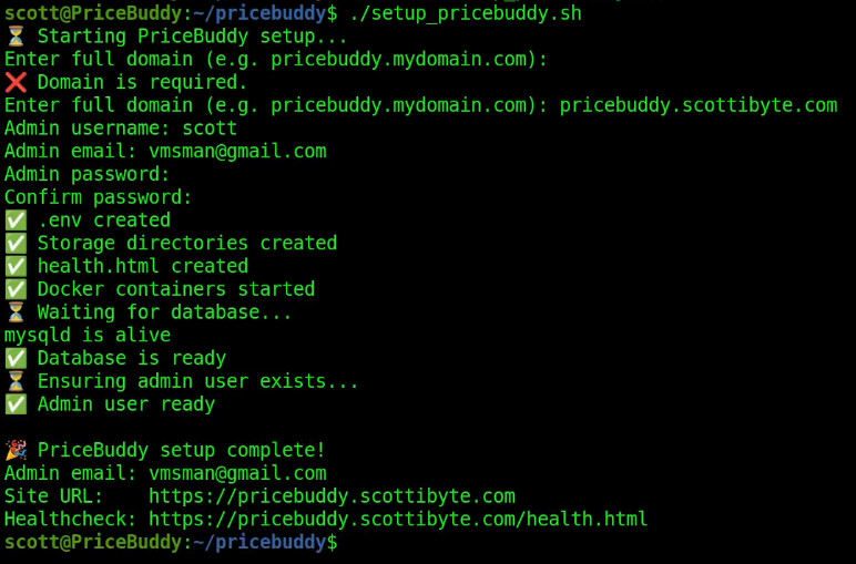 After the script completes, the application is up and running, but it is configured to use your subdomain name. We have additional steps before you can access PriceBuddy. You can check the running app.