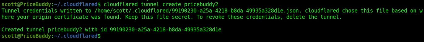 Create the tunnel up to Cloudflare. The tunnel name is arbitrary and I called mine pricebuddy2 because I already had one named pricebuddy for my production application.