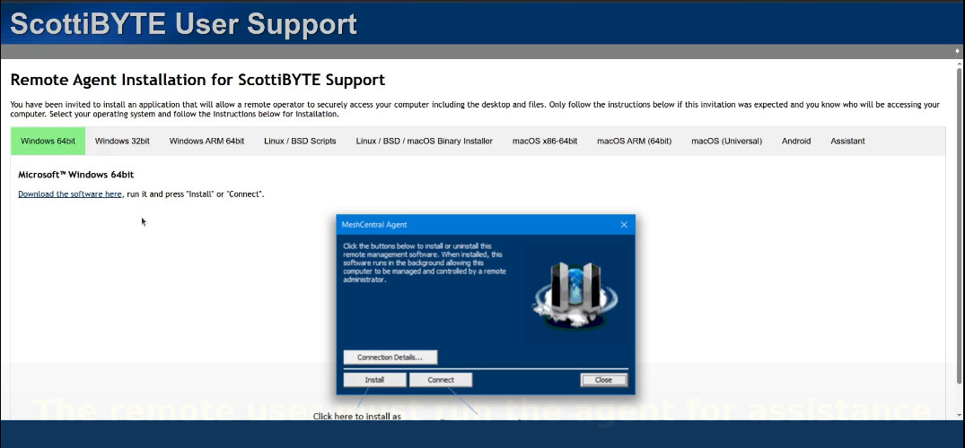 The MeshCentral “Instant Client” is a link that you can send to someone you want to have download a client that is installed for a one-off support session. Once they disconnect from the instant session, there is no access to their system unless they explicitly begin another session.