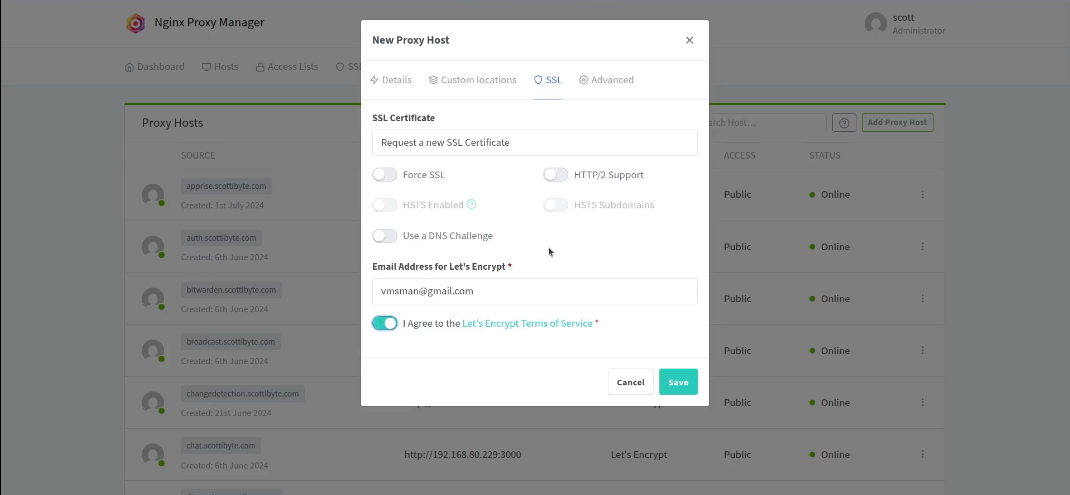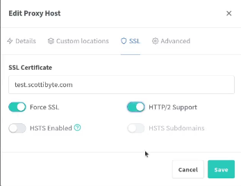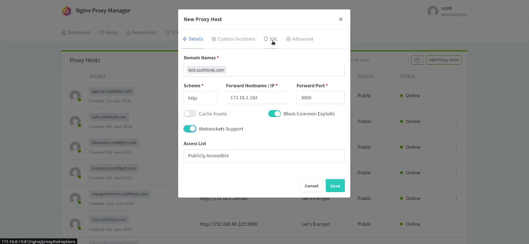 Go to your NginX Proxy Manager and add a new proxy record with your domain name (matches the one in config.json) and the address you just found and the other settings below.
