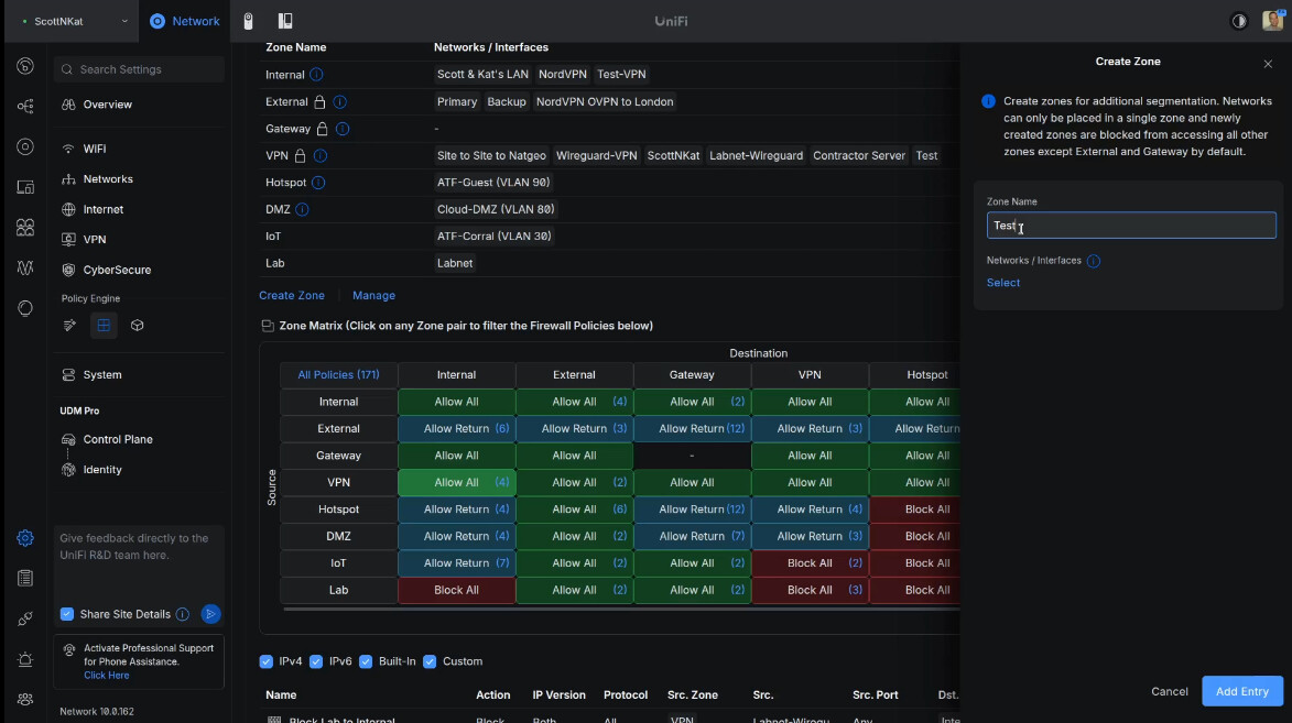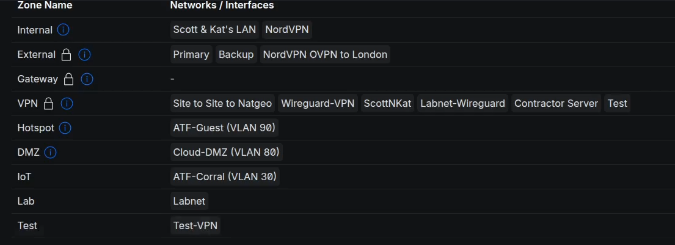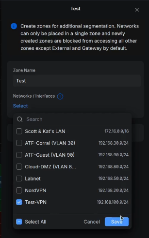 At this point, our VPN user “scott” would have access to everything on my network. I want to limit that. I didn’t want to conflict with my production environment and so I created a Test Zone to move the “Test-VPN” network into.