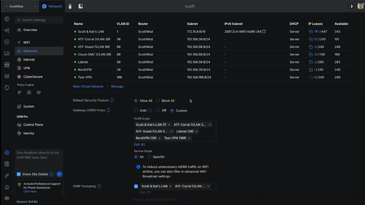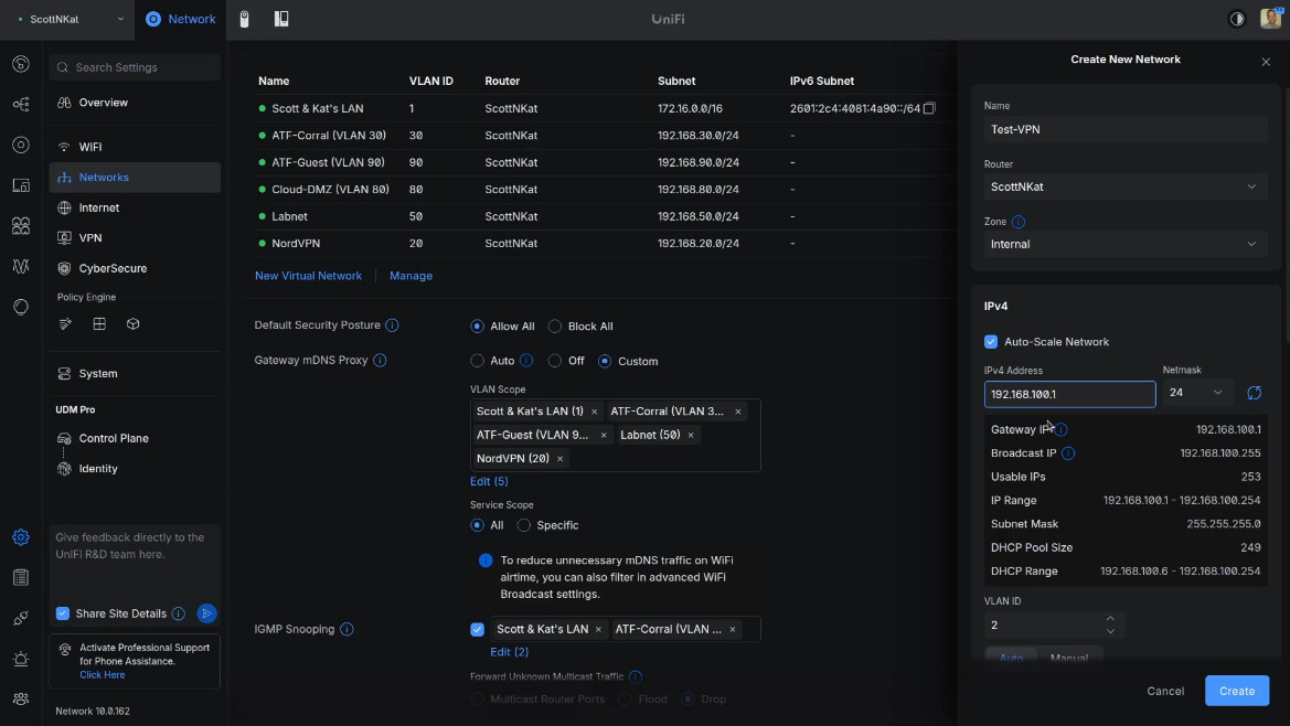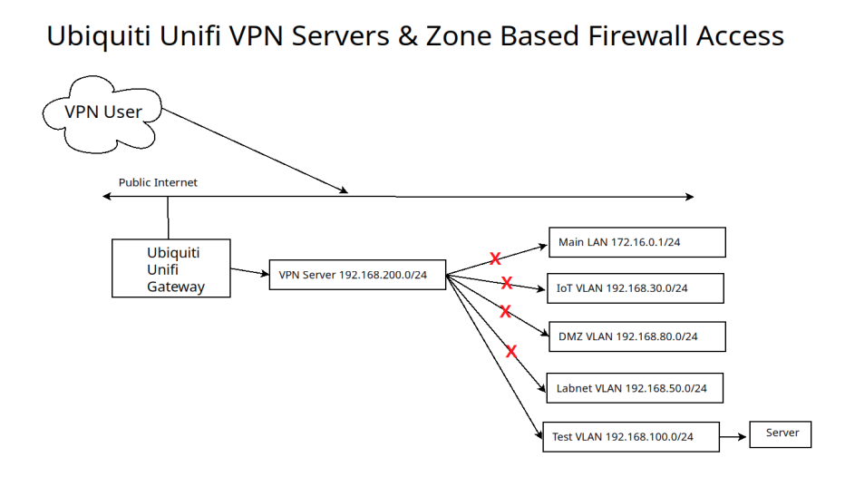 By default, Unifi VPN servers provide access to your entire network. This tutorial discusses how to limit external VPN access to selected networks or even systems. In this presentation, I created a “Test VLAN” network and a “Test VPN” server. I created a user who can access all systems on the “Test VLAN”, but they are blocked from accessing my “Main LAN”, “IoT VLAN”, “DMZ VLAN” and my “Labnet VLAN. Here’s how that might look.