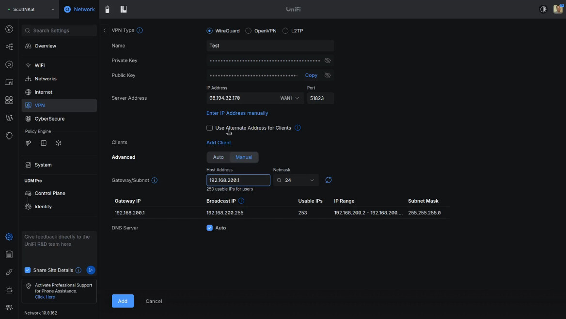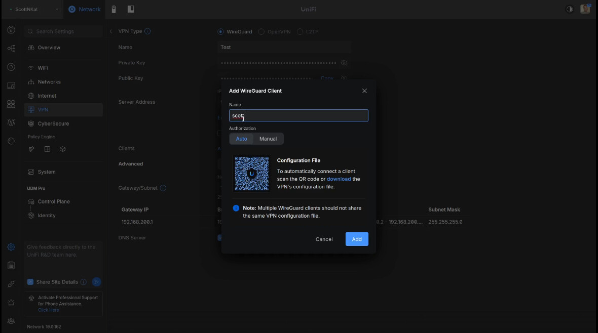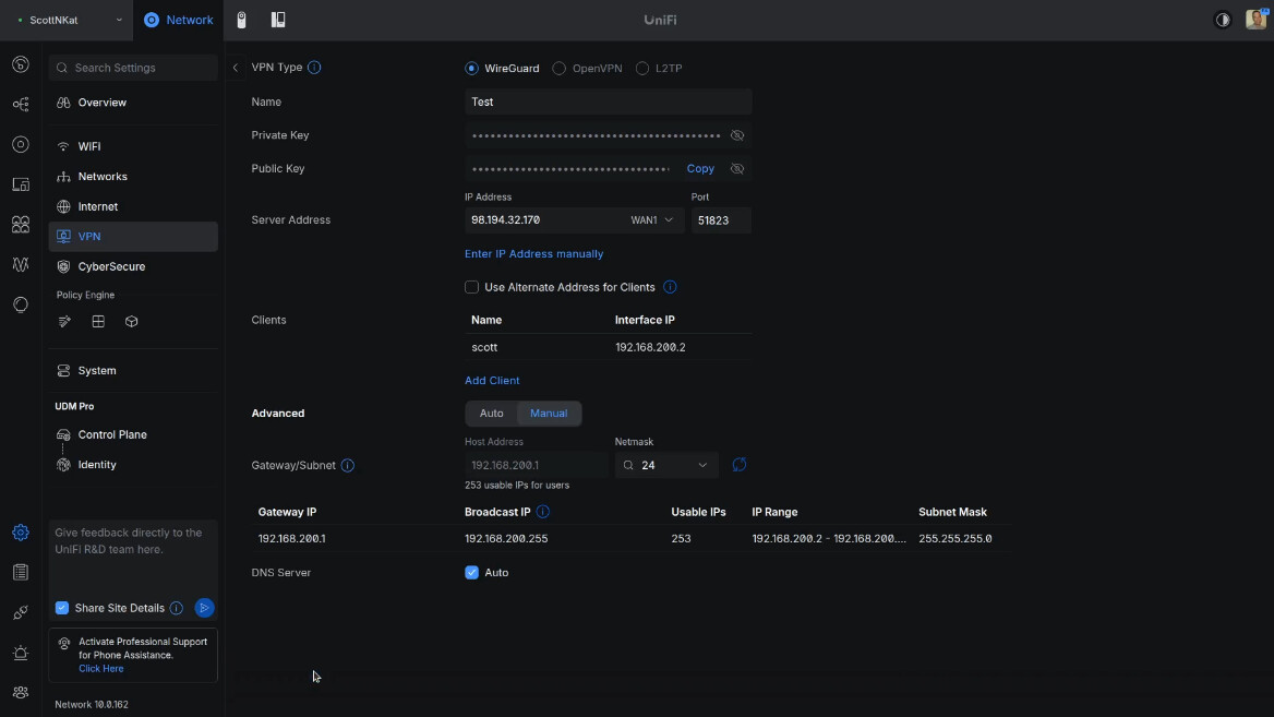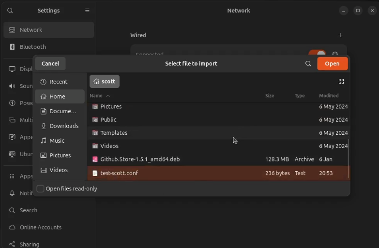 I imported the test-scott.conf file that I exported when I created my user in the Unifi VPN server.