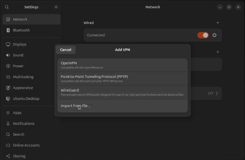 My Ubuntu deskop has a local address of 172.16.2.49. I opened the settings window in Ubuntu. Go to “Network”. Click on the option to add a VPN connection and select “Import from file…”.