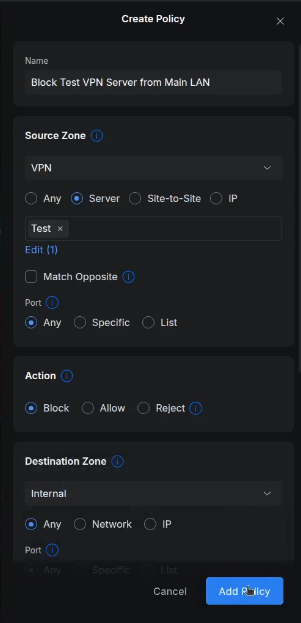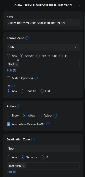 I selected the Source Zone as VPN and the Destination Zone as Test in the tutorial. Initially the Test Zone is blocked. I added a policy to grant all users from the Test VPN to be able to access the Test-VPN network inside the Test Zone.