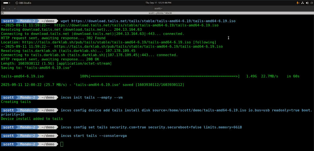 Log into your Incus server and download the ISO image for the Tails OS (Note: new versions are frequently released):