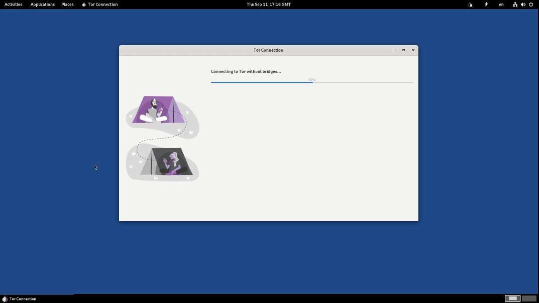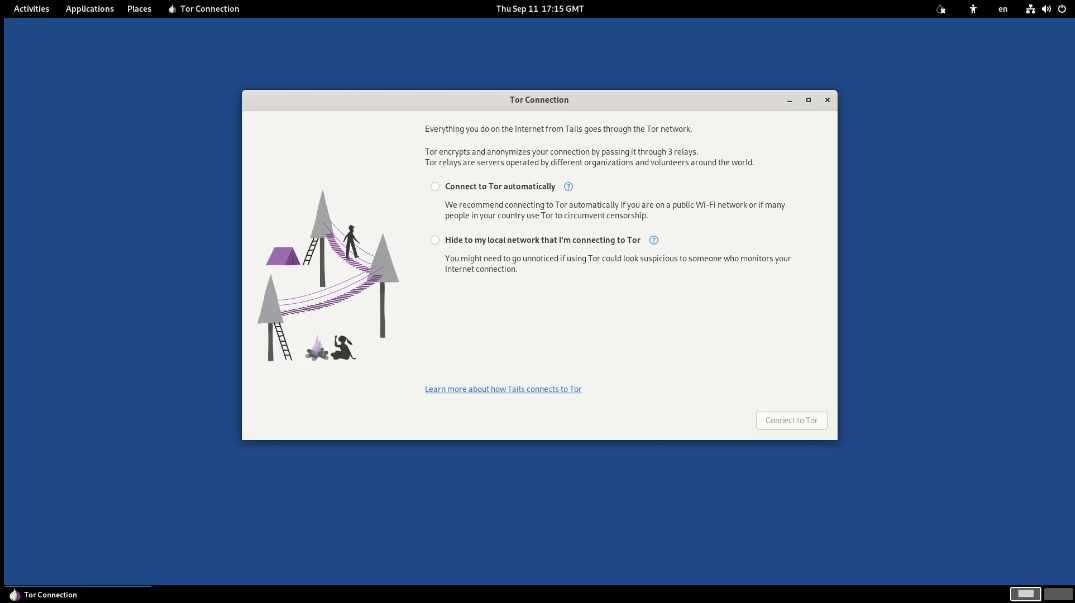 The next screen provides the options to connect to the Tor network. I choose the first option because I am running from my local LAN which is trusted.