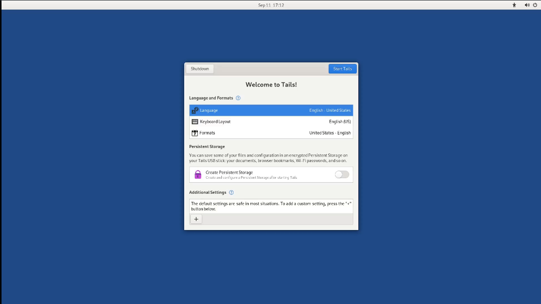 When Tails OS boots, it asks for language and keyboard defaults. It’s my advice not to configure persistent storage because that potentially may defeat security goals.
