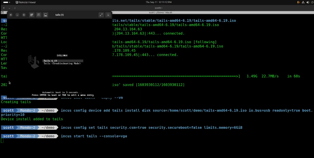 incus config device add tails install disk source=/home/scott/demo/tails-amd64-6.19.iso io.bus=usb readonly=true boot.priority=10