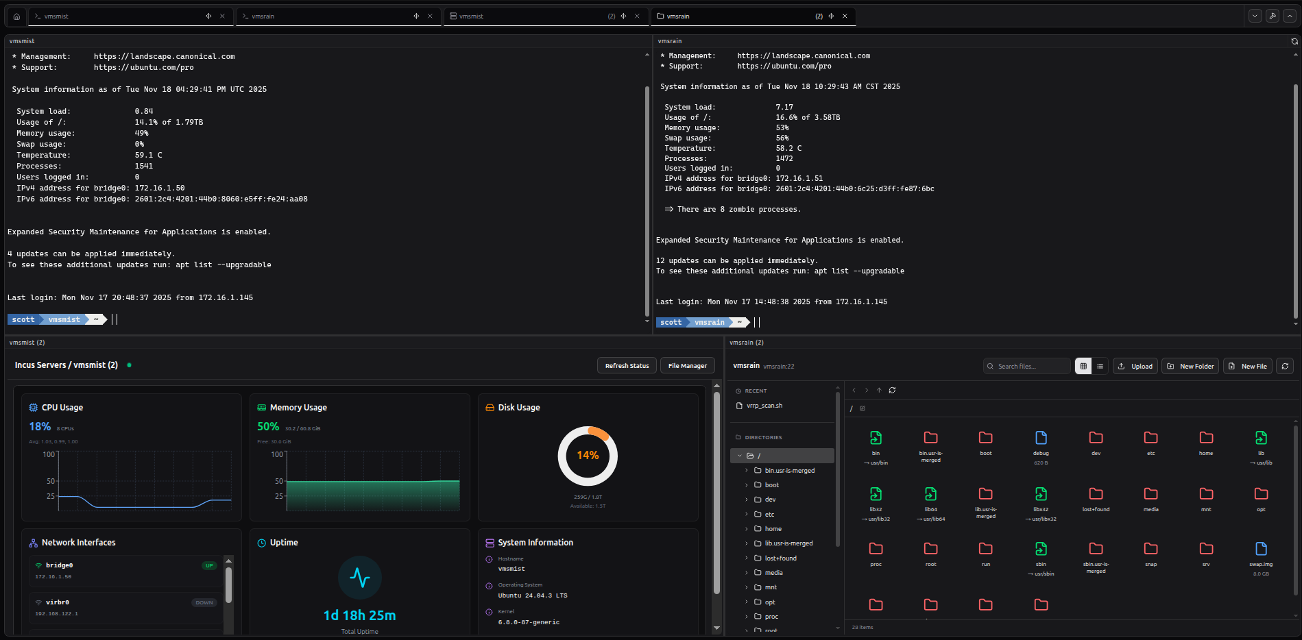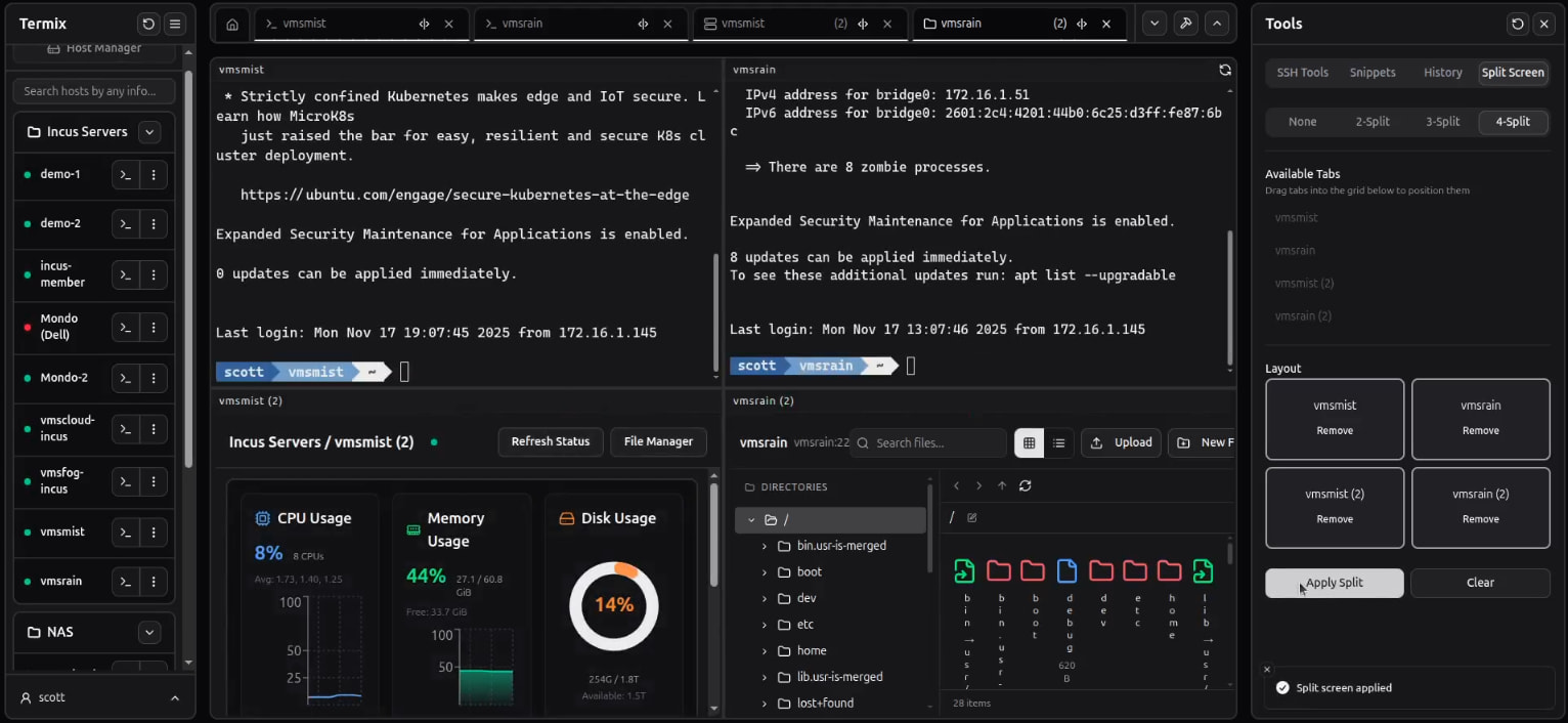 Termix provides ssh terminal access, server stats, and a remote file manager all in an elegant windowed interface facilitating working with multiple systems at once. There is built-in management of ssh keys, multi-factor authentication and ssh tunnels.