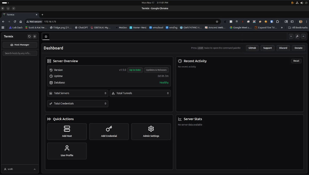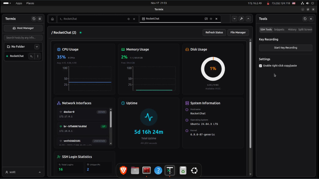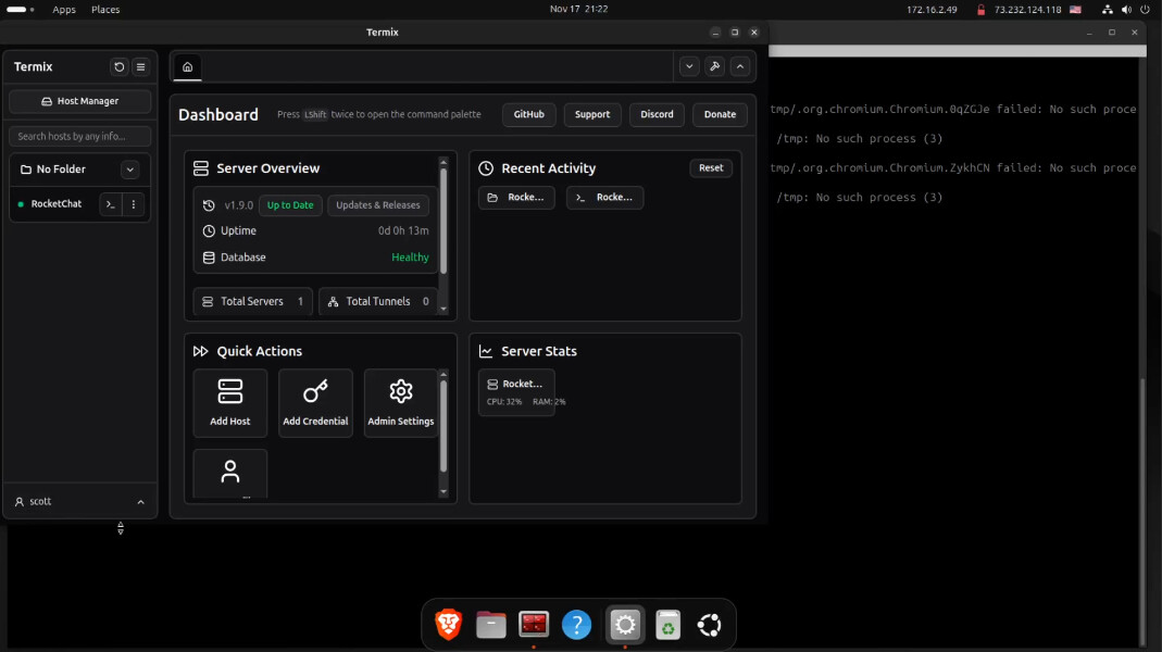 Termix is an open source Terminal Access Manager comparable to the popular commercial program Termius. The Termix server is self-hosted in Docker and there are clients for Windows, MacOS, Linux, IoS, Android and it can be accessed from your favorite web browser as well.