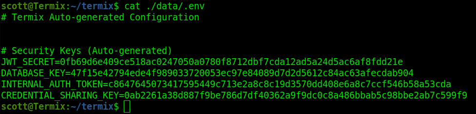 Change the TERMIX_DB_ENCRYPTION_KEY: “****” so that the DATABASE_KEY you just found is between the quotes and replaces the **** Save the file with a CTRL O and enter and CTRL X to exit the nano editor.