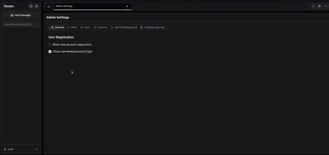 For additional security in my homelab, I decided to turn off the ability for allowing users to register new Termix accounts in the admin settings.