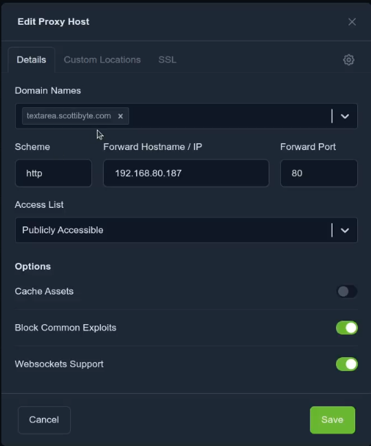 The assumption is that you have purchased a domain name and created a subdomain. The easiest way to host a reverse proxy is via NginX Proxy Manager which I have covered many times before. An example of creating the proxy would be: