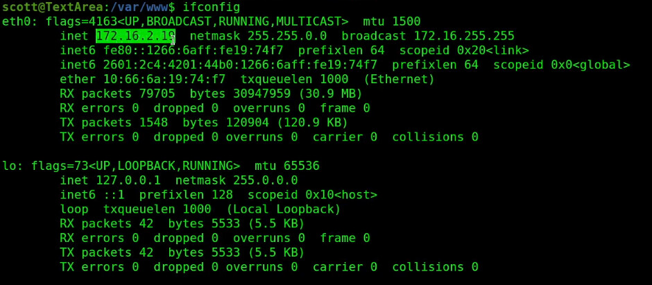 Copy the ip address of your eth0 device. Yours will differ from mine.